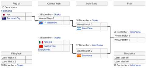 Đội thắng của cặp đấu thứ nhất vào bán kết gặp nhà vô địch Copa Libertadores là River Plate (Argentina) ngày 16/12, trong khi đội thắng của cặp đấu thứ 2 sẽ phải đụng độ gã khổng lồ Barcelona – đương kim vô địch UEFA Champions League một ngày sau đó.