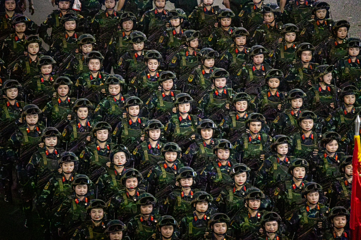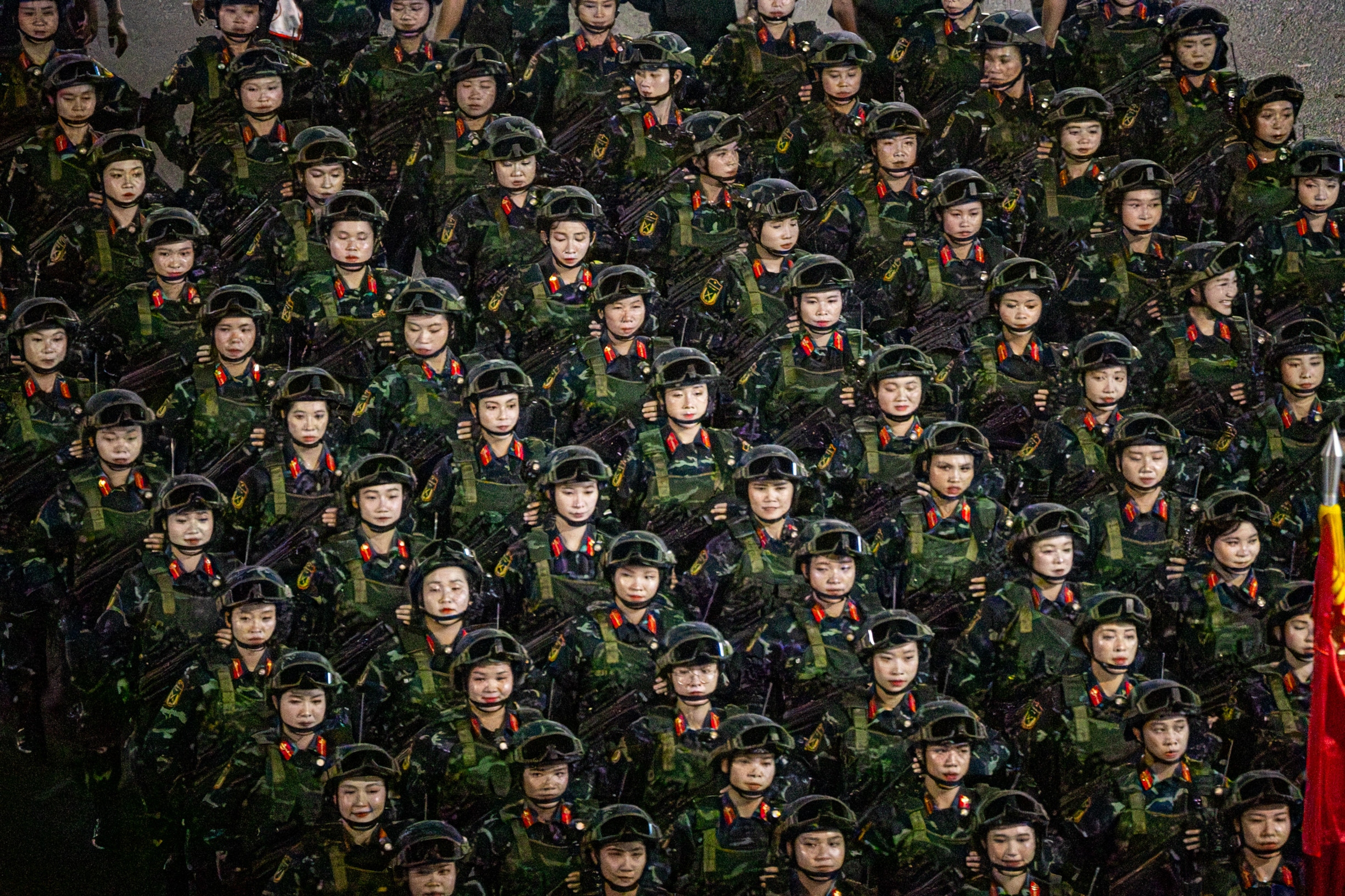 Dưới ánh đèn rực sáng, từng khối diễu binh, diễu hành trùng trùng điệp điệp nối tiếp nhau, tạo thành bức tranh vừa hùng tráng, vừa trang nghiêm kỷ luật.