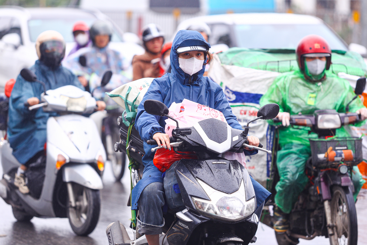 Trong cơn mưa phùn kéo dài, việc đi lại của người dân càng thêm vất vả, nhiều phương tiện phải di chuyển chậm để đảm bảo an toàn.