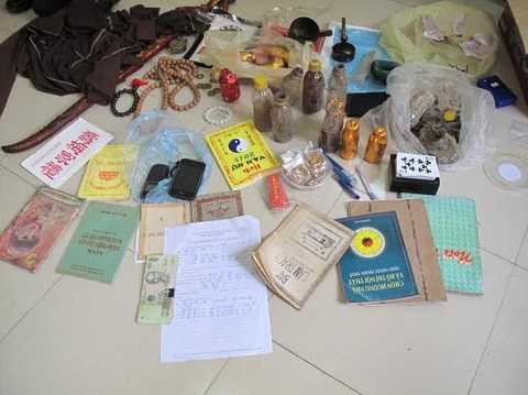 Tại hiện trường thu được 3 gói bột và 5 gói thuốc dạng viên màu vàng mà chúng dùng để "trừ ma", cùng với các đồ vật hóa trang thành người "bề trên", 2 bộ bài xem tướng số và 14 cuốn sách có nội dung mê tín dị đoan.