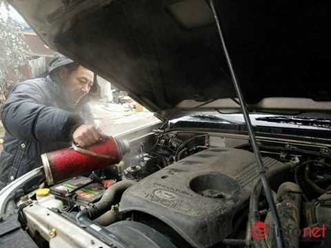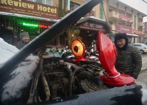 Chủ nhân chiếc xe này ở Sapa dùng 2 quạt sưởi cho máy, nhưng dường như cách này ít hiệu quả vì dầu vẫn đông đặc trong đường ống và động cơ, khiến bơm dầu bị nghẹt, động cơ không được bơm nhiên liệu liên tục nên chỉ nổ ậm ạch rồi lại chết máy.