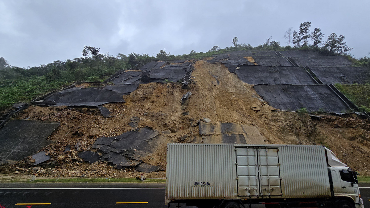Sau bão số 6, đồi hai bên cao tốc La Sơn - Hòa Liên nứt toác, "áo" bê tông nát tươm chực chờ sạt lở, đe dọa xe cộ lưu thông trên đường.