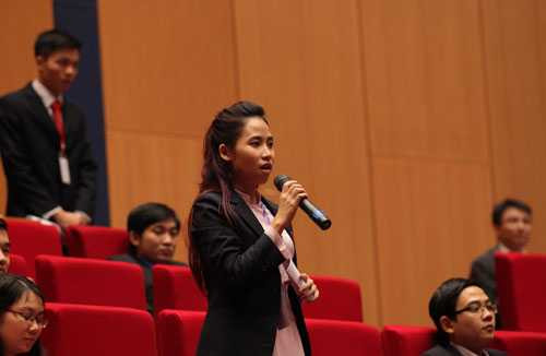 | Đại biểu Phạm Liên Hà (Học viện ngoại giao) đặt câu hỏi |