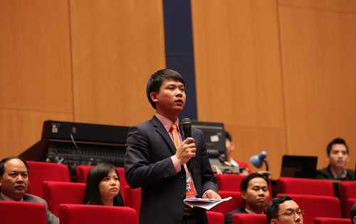 ĐB Võ Xuân Vinh, đại diện Đoàn khối các cơ quan T.Ư xung phong đặt câu hỏi cho Bộ trưởng Khoa học công nghệ (KHCN) Nguyễn Quân: "Hiện những cán bộ trẻ ở các cơ sở khoa học công nghệ gặp khó khăn là lương, thu nhập rất thấp.