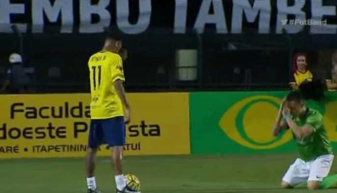 Neymar có bóng ở cuối sân, trước mặt là Fred, một ngôi sao khá nổi tiếng của đội tuyển Brazil. Không rõ có phải vì muốn gây cười hay không, Fred quỳ xuống, chắp tay lạy Neymar, như thể mong Neymar đừng lừa qua mình bằng kỹ thuật cá nhân tuyệt vời.