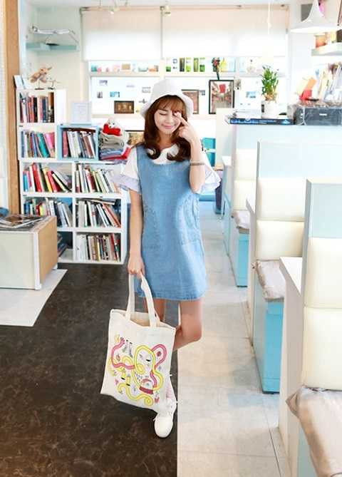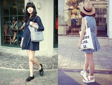 | Túi tote vải bố tưởng chừng mạnh mẽ, bụi bặm nhưng vẫn rất đáng yêu khi phối cùng đầm nữ tính. |