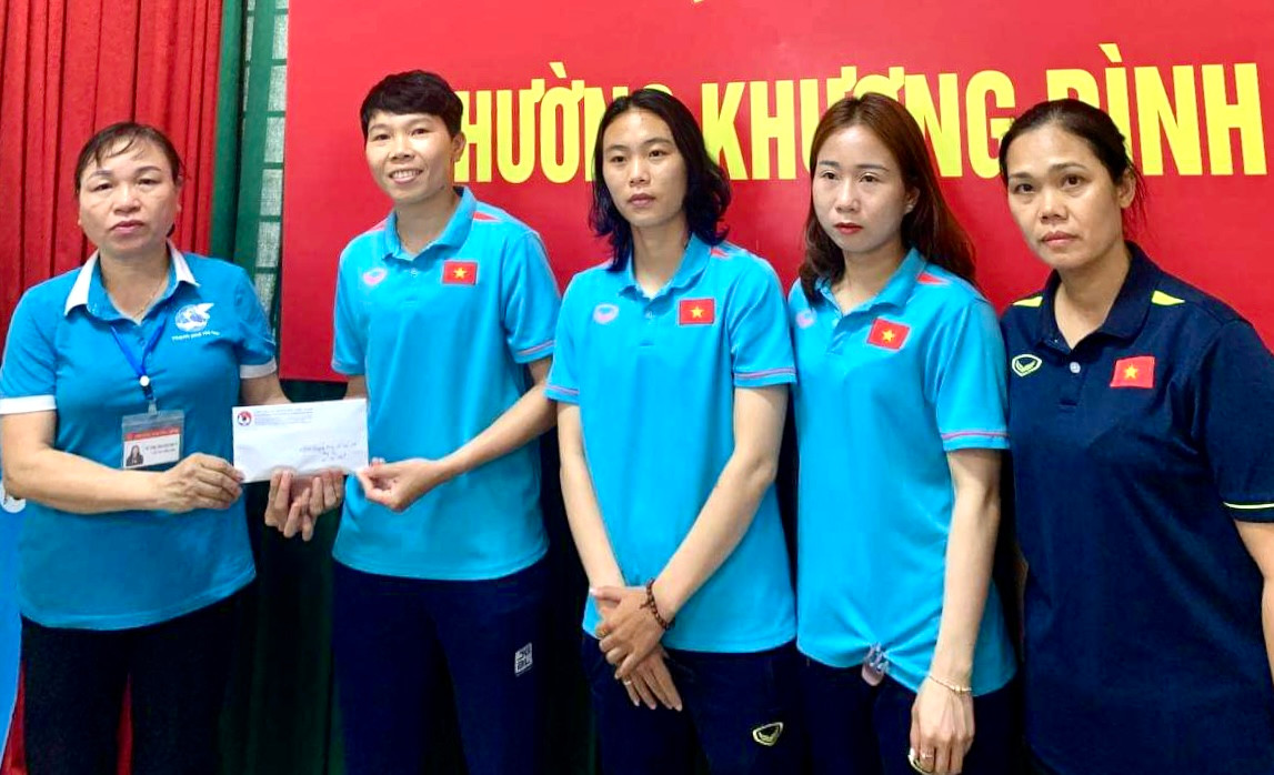 Trưa 17/9, thủ môn Trần Thị Kim Thanh, trung vệ Lê Thị Diễm My và tiền đạo Phạm Hải Yến đại diện đội tuyển nữ Việt Nam đến Ủy ban MTTQ phường Khương Đình (quận Thanh Xuân) trao 40 triệu đồng nhằm chia sẻ khó khăn với các nạn nhân vụ cháy chung cư mini.