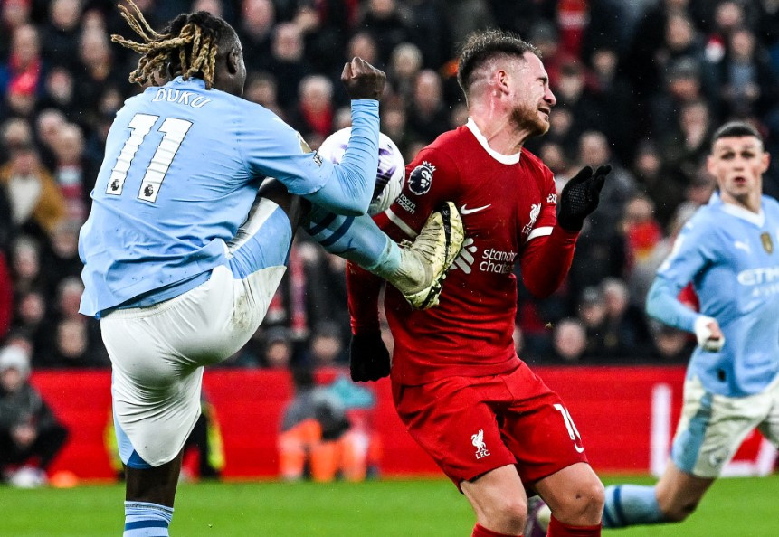 Phút bù giờ 90+8, Alexis Mac Allister lăn lộn trên sân sau khi hứng cú đạp bằng gầm giày của Jeremy Doku vào vùng ngực. Tuy nhiên, cả trọng tài chính Michael Oliver và tổ VAR đều từ chối cho Liverpool hưởng phạt đền. Video làm chậm cho thấy Doku dường như đã khẽ chạm bóng trước. Tuy nhiên, cầu thủ này đã có pha cao chân và có thể gây nguy hiểm cho đối thủ.
