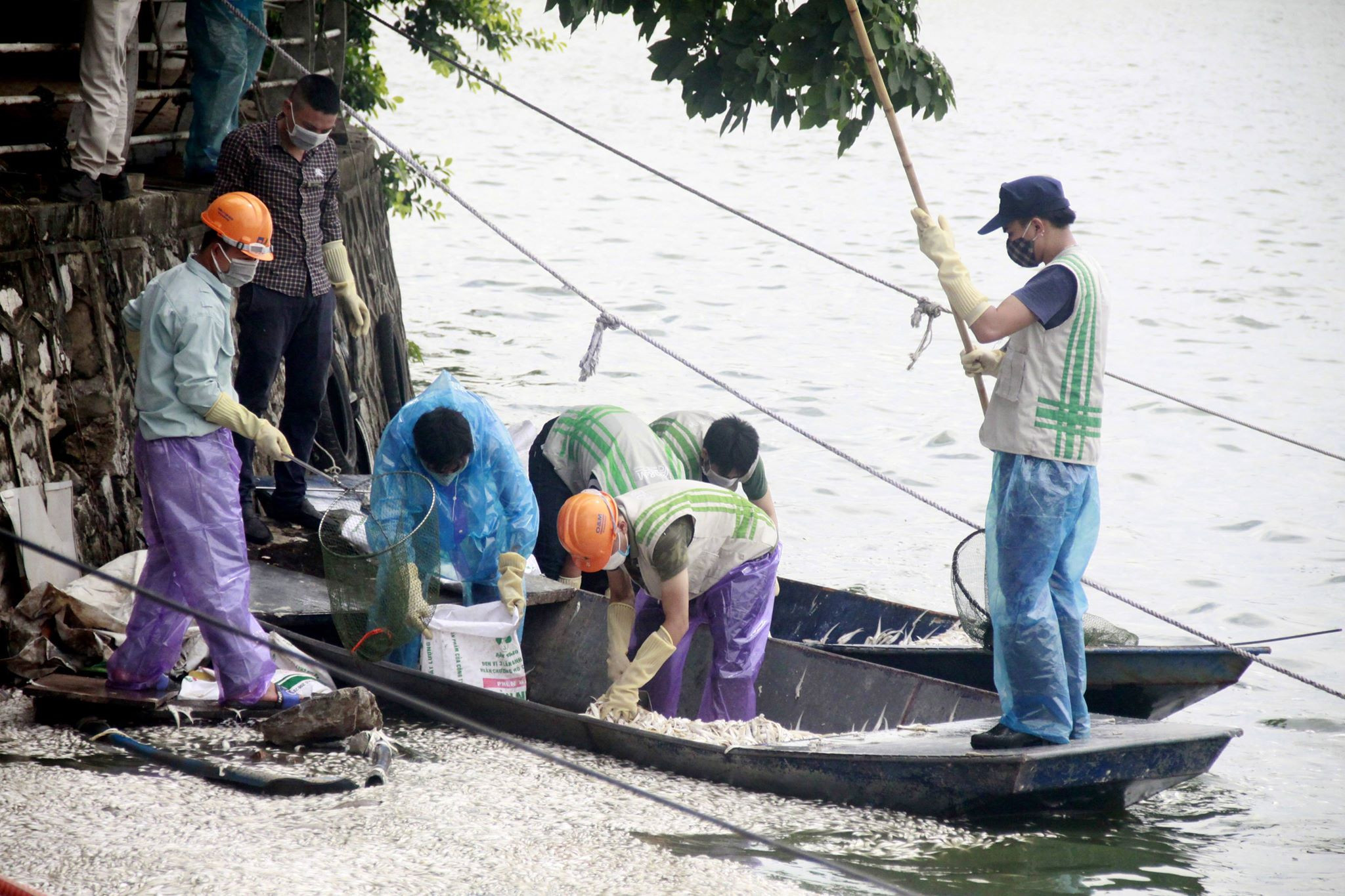 Lực lượng chức năng thu vớt cá chết trên mặt Hồ Tây.