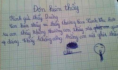 Trong đơn, bé Trà My viết: “Con kiện thầy vì thầy thương bạn Linh Chi, thầy không thương con. Thầy rất quá đáng. Thầy không công bằng. Con ghét thầy. Ngày mai con không hát đâu. Thầy mà không thương con nữa. Trên đời này con ghét thầy nhất”.Trong khi đó bé Mẫn viết: “Con kiện thầy vì thầy thương bạn Linh Chi hơn tụi con. Thầy không thương con. Thầy rất quá đáng. Thầy không công bằng, con ghét thầy".Trước làn sóng phản đối của bạn bè, bé Linh Chi đã phải viết thư cho thầy cầu cứu: “Thầy ơi, mấy bạn thấy con có bút kim cương cái mấy bạn lại thấy mấy bạn có bút thường liền lấy đơn kiện thầy đó thầy. Thầy kêu mấy bạn đó thôi kiện ngay, con không muốn bị cướp bút mới".Thầy Dũng phân trần: "Thực tình thì số bút đó tôi mua cùng loại, chỉ là khác nhau chút thôi chứ không có cái nào đắt hơn cái nào. Nhưng các em học sinh ở đây là vậy đó, 11 tuổi nhưng mà điệu lắm, cứ thấy thầy đến là quây. Chúng nó làm nũng dữ lắm nhưng xa chúng nó một ngày thì lại nhớ". |