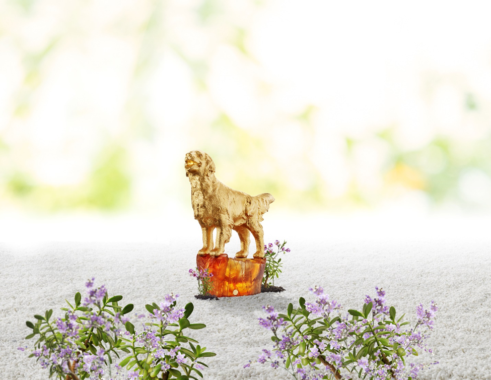 Đầu tiên là tượng chó vinh quang với giống chó Golden Retriever. Mang tư thế đĩnh đạc và khỏe mạnh, chú chó Golden uy nghi đứng vững chãi trên đỉnh đế Liu Li cao quý với hình quan tiền tô điểm bởi quả nguyệt quế, đem lại vinh quang cao nhất cho người được tặng.