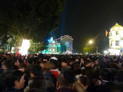 Sau 10h tối, khu vực quanh hồ Hoàn Kiếm cũng không thật đông đúc dù vẫn có một lượng lớn người theo dõi tường thuật trực tiếp chương trình đếm ngược đón giao thừa ở tượng đài Cảm tử qua màn hình cỡ lớn.
