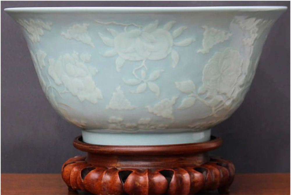 Chiếc bát sứ nhỏ màu trắng và xanh lam nhạt. Nó được chạm khắc tinh xảo với những bông hoa sen, mẫu đơn, cẩm quỳ, cùng với những quả thạch lựu, hồng, đào.