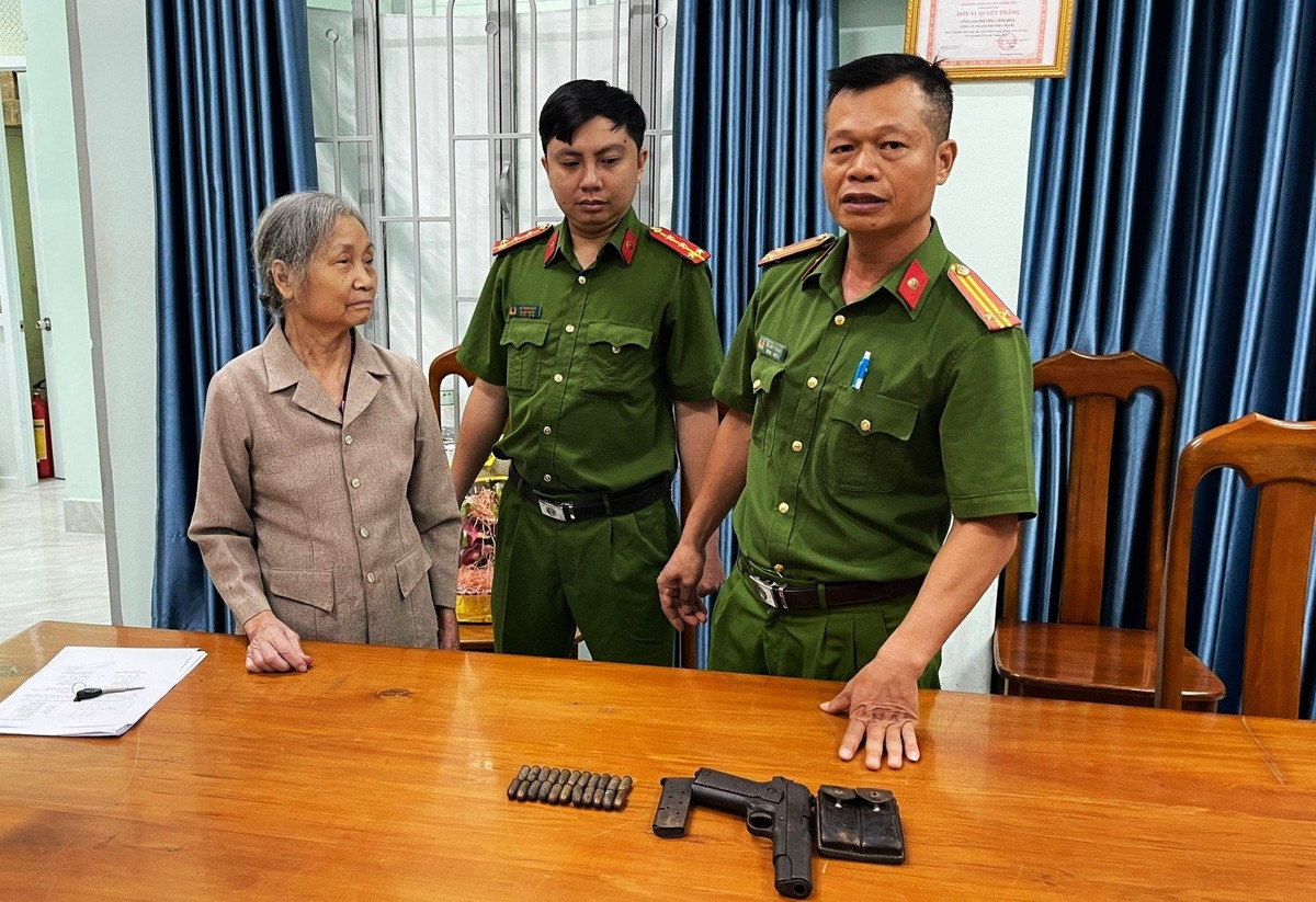 Bà Nguyễn Thị Nồng cho biết trong lúc dọn nhà đã phát hiện 1 khẩu súng ngắn, 1 hộp tiếp đạn và 22 viên đạn. Ngay sau đó, bà đã lên trụ sở Công an phường Vĩnh Hòa (TP Nha Trang) để giao nộp.