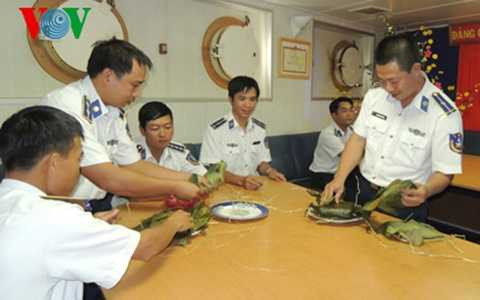 Vào trong khoang tàu, không khí càng nhộn nhịp hơn. Trong căn phòng khách mà các chiến sĩ gọi là Câu lạc bộ, mỗi người một việc, tự mình gói và nấu những chiếc bánh chưng. Đôi bàn tay của các chiến sĩ có người khéo, có người không; chiếc bánh cũng không hẳn thật là vuông vức nhưng chứa đựng niềm mong chờ về một cái Tết xa nhà nhưng vẫn đủ đầy.