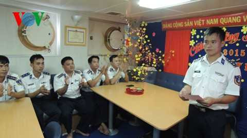 Căn phòng này là nơi anh em chiến sĩ sẽ tụ họp trong đêm giao thừa, đón chờ nghe lời chúc Tết của Chủ tịch nước qua làn sóng của Đài Tiếng nói Việt Nam. Sau đó, Chính trị viên tàu 9001 đọc lời chúc Tết của Bộ Tư lệnh Vùng Cảnh sát biển 3. Giây phút hào hứng nhất là lúc các anh đếm ngược thời gian, chào đón thời khắc bước sang năm mới. Chính tay thuyền trưởng Nguyễn Văn Hà khui chai sâm banh chúc mừng năm mới đến từng anh em chiến sĩ và kèm theo phong bì lì xì cùng nhiều phần quà.