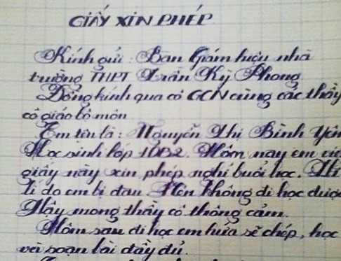 | Nét chữ "rồng bay, phượng múa" của Yên trong đơn xin nghỉ học được cộng đồng mạng khen ngợi. |