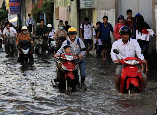 | Hẻm 51 đường 3-2 cũng như các hẻm lớn của TP.Cần Thơ ngập sâu trong nước. Ảnh chụp sáng 8/10 (TNO) |