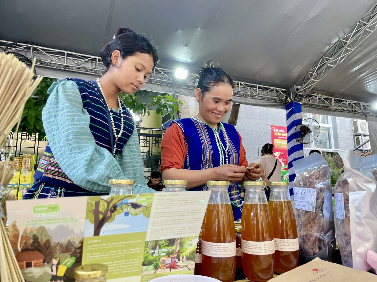 Bà con mang lá dong, măng khô, rau rừng... từ bản làng về giới thiệu với khách TP.HCM. Ảnh: H. Linh)
