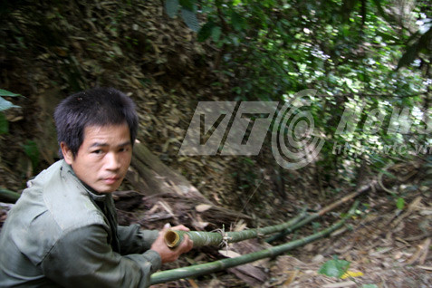 Trong khi chúng tôi vạch từng bụi cỏ, tìm hiểu về rắn rết, thì nhóm thanh niên tiến vào rừng chặt bương, kéo ra chất đống ở miệng hang.