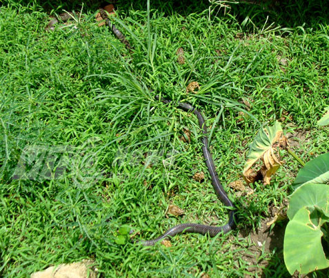 Đang vạch bụi cỏ, tôi chợt giật mình khi gặp cặp rắn đang phơi nắng. Thấy người lạ, chúng trốn vào bụi rậm.Ông Quân chạy đến xem và bảo đó là hổ trâu. Hổ trâu là loài bị giới bắt rắn săn lùng ráo riết. Chúng là loài rắn không có nọc độc, nên ông Quân không sợ.