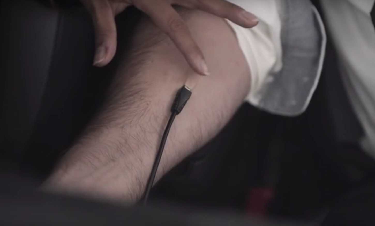 Một nhân viên bán hàng của hãng Skoda đã gây sốc với vị khách nữ khi anh này cắm trực tiếp dây cáp nối của chiếc xe Fabia vào cổng cắm USB, dường như được cấy ghép trên bắp tay của anh ta.