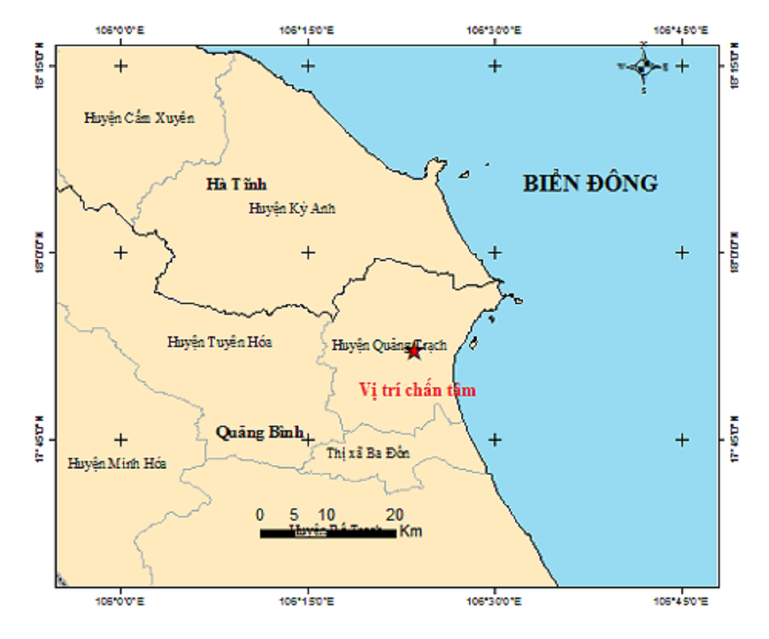 Cụ thể, trận động đất xảy ra vào lúc 6h55 phút ngày 25/10 tại tọa độ 17.868 độ Vĩ Bắc-106.392 độ Kinh Đông (thuộc huyện Quảng Trạch). Độ sâu chấn tiêu khoảng 12 km, cấp độ rủi ro thiên tai cấp 0.