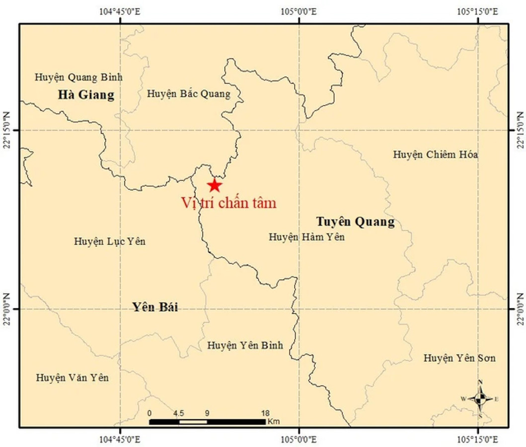 Theo đó, vào lúc 16h16 cùng ngày, trận động đất xảy ra tại vị trí có tọa độ (22.174 độ vĩ bắc, 104.883 độ kinh đông), độ sâu chấn tiêu khoảng 10 km tại khu vực huyện Hàm Yên, tỉnh Tuyên Quang.