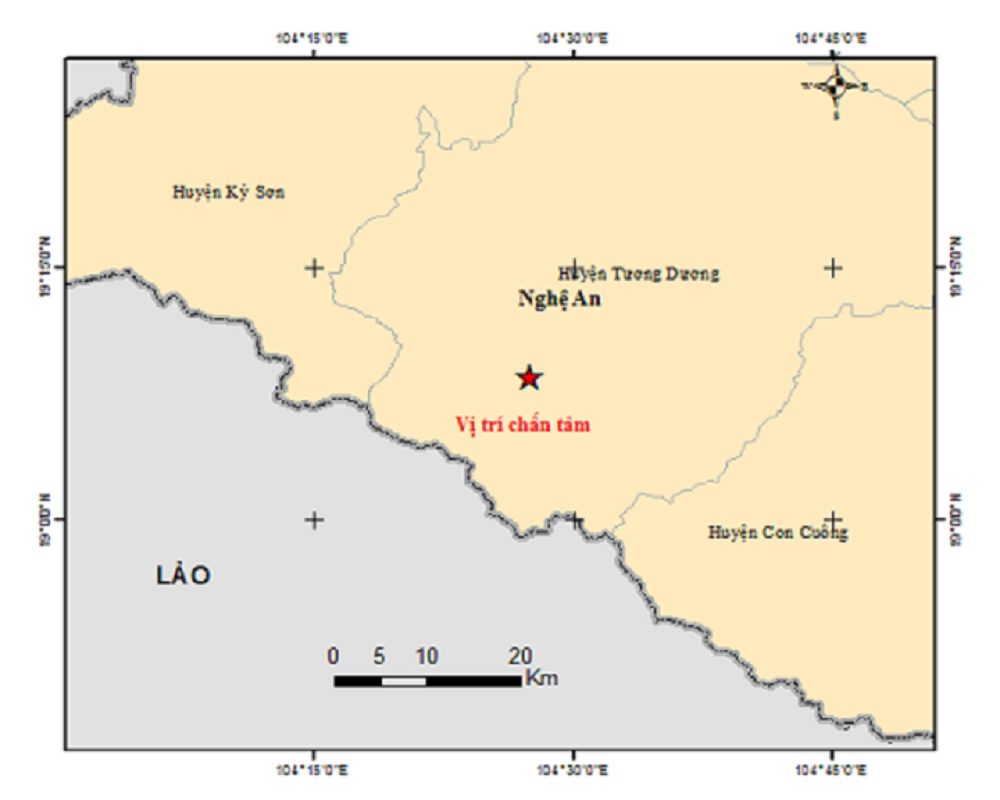 Vị trí tâm chấn trận động đất xảy ra tại Nghệ An.