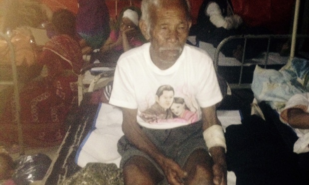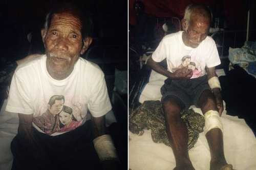 | Cụ ông Funchu Tamang trong bệnh viện với vết thương nhẹ ở tay và chân |