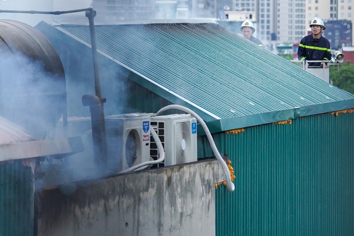 Trung úy Vũ Đình Khá kể, khoảng 13h30 ngày 1/8, khi nhận được thông tin có đám cháy quán karaoke tại số 231 Quan Hoa, phường Quan Hoa, quận Cầu Giấy, Trung tâm chỉ huy Công an thành phố Hà Nội điều động 10 xe chữa cháy cùng hơn 60 cán bộ chiến sĩ đến hiện trường.