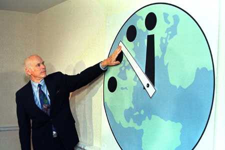 Bản tin của các nhà khoa học nguyên tử (BAS) thông báo kim của đồng hồ tận thế được vặn thêm một phút về phía điểm 24h vào ngày 10/1. Như vậy nó chỉ còn cách thời điểm cuối cùng (12 giờ đêm) của “ngày tận thế” đúng 5 phút. Quyết định điều chỉnh kim đồng hồ được đưa ra trong một hội nghị chuyên đề của BAS tại thủ đô Washington của Mỹ, BBC đưa tin.