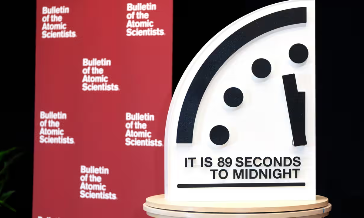 Các nhà khoa học nguyên tử đặt "đồng hồ tận thế" ở mức 89 giây cách nửa đêm. Con số này gần mốc "tận thế" hơn một giây so với năm ngoái. Tổ chức phi lợi nhuận có trụ sở tại Chicago đã tạo ra chiếc đồng hồ này vào năm 1947 trong thời kỳ căng thẳng của chiến tranh lạnh sau Thế chiến thứ hai để cảnh báo công chúng về việc loài người tiến gần đến việc "hủy diệt" thế giới như thế nào.