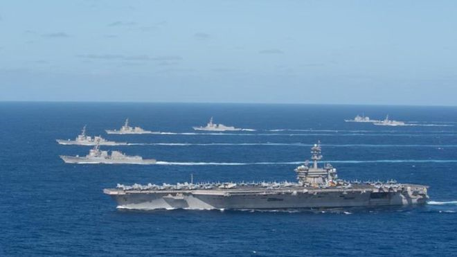 Mỹ tiến hành nhiều cuộc tập trận với đồng minh trong khu vực vào tuần trước. Trong số này bao gồm cuộc diễn tập với Nhật Bản ở biển Hoa Đông, với Australia ở phía đông Thái Bình Dương và với Ấn Độ ở Ấn Độ Dương.