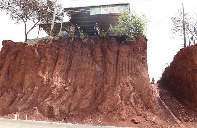 Việc hạ cốt nền, thi công mở rộng tuyến đường ĐT.753 khiến nhiều nhà dân nằm cheo leo trên mép đường ở độ cao 8-9m. (Ảnh: Đậu Tất Thành/TTXVN)