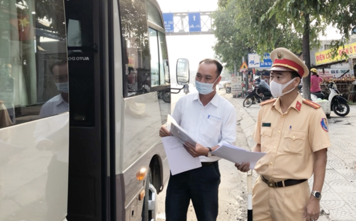 CSGT kiểm tra giấy xém nghiệm COVID-19 với xe chở người lao động tại chốt kiểm soát dịch cầu Đồng Nai. (Ảnh: Khuất Nguyên)