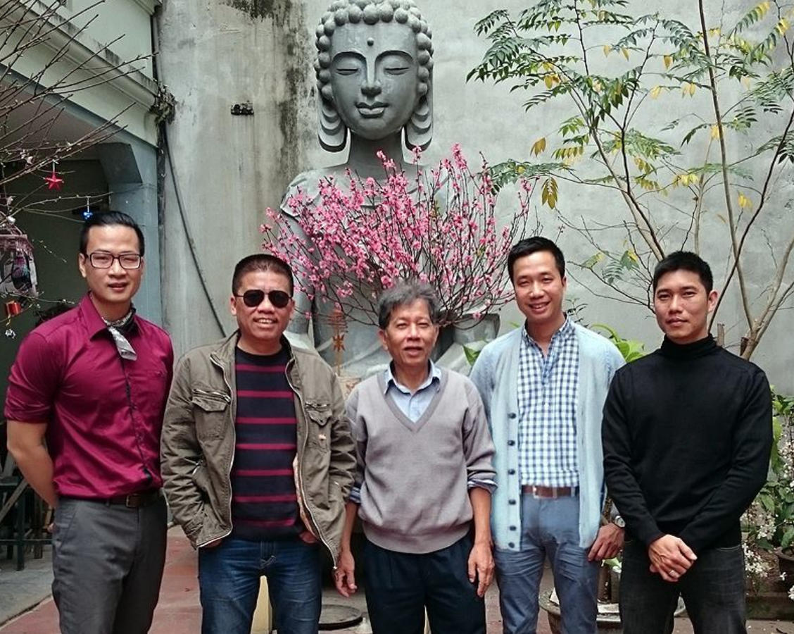 Từ trái qua phải: họa sĩ Kim Duẩn, nhà văn Nguyễn Việt Hà, nhà văn Nguyễn Huy Thiệp, nhà văn Trương Quý và con trai nhà văn. (Ảnh chụp Tết 2015)