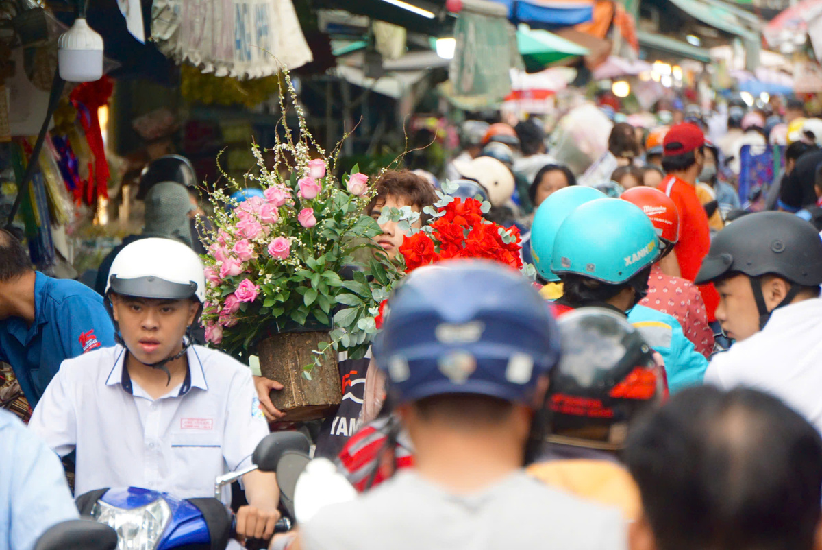 Chiều tối 7/3, thời điểm được xem là chính vụ của dịp lễ đặc biệt dành cho phụ nữ, chợ thu hút cả nghìn khách cùng lúc. Mọi người phải chen chúc, luồn lách để tìm lối đi.