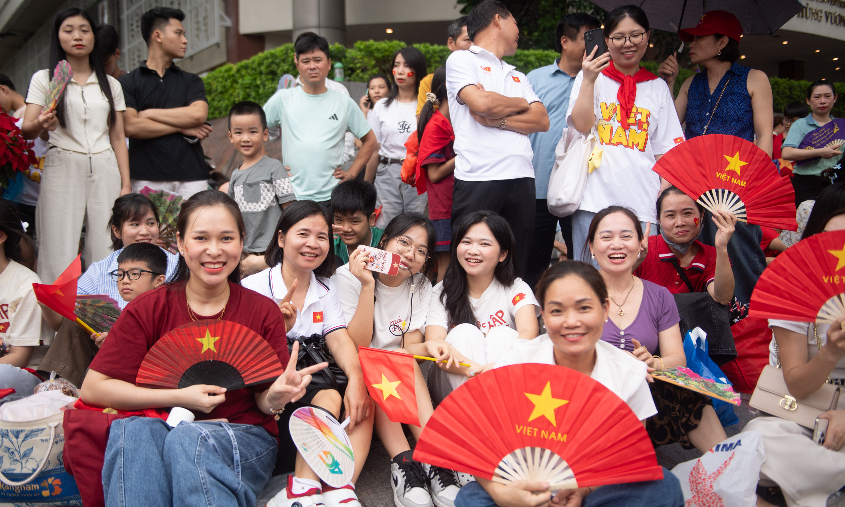 Người dân Thủ đô háo hức xếp hàng từ sáng sớm, tươi cười vẫy cờ và quạt in hình quốc kỳ, chờ đón buổi tổng hợp luyện diễu binh tại Quảng trường Ba Đình.