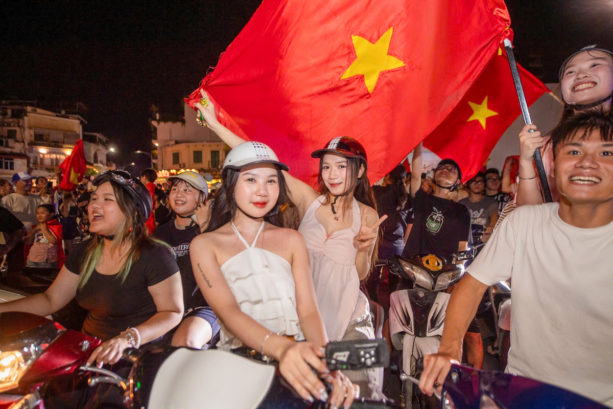 Các cổ động viên trẻ tuổi, người đi xe máy, người đi bộ cùng hô vang “Việt Nam vô địch!” trong niềm hân hoan khó giấu. Một số nhóm đốt pháo sáng, nhảy múa giữa đường trong ánh đỏ rực, tạo nên khung cảnh cuồng nhiệt và đầy cảm xúc.