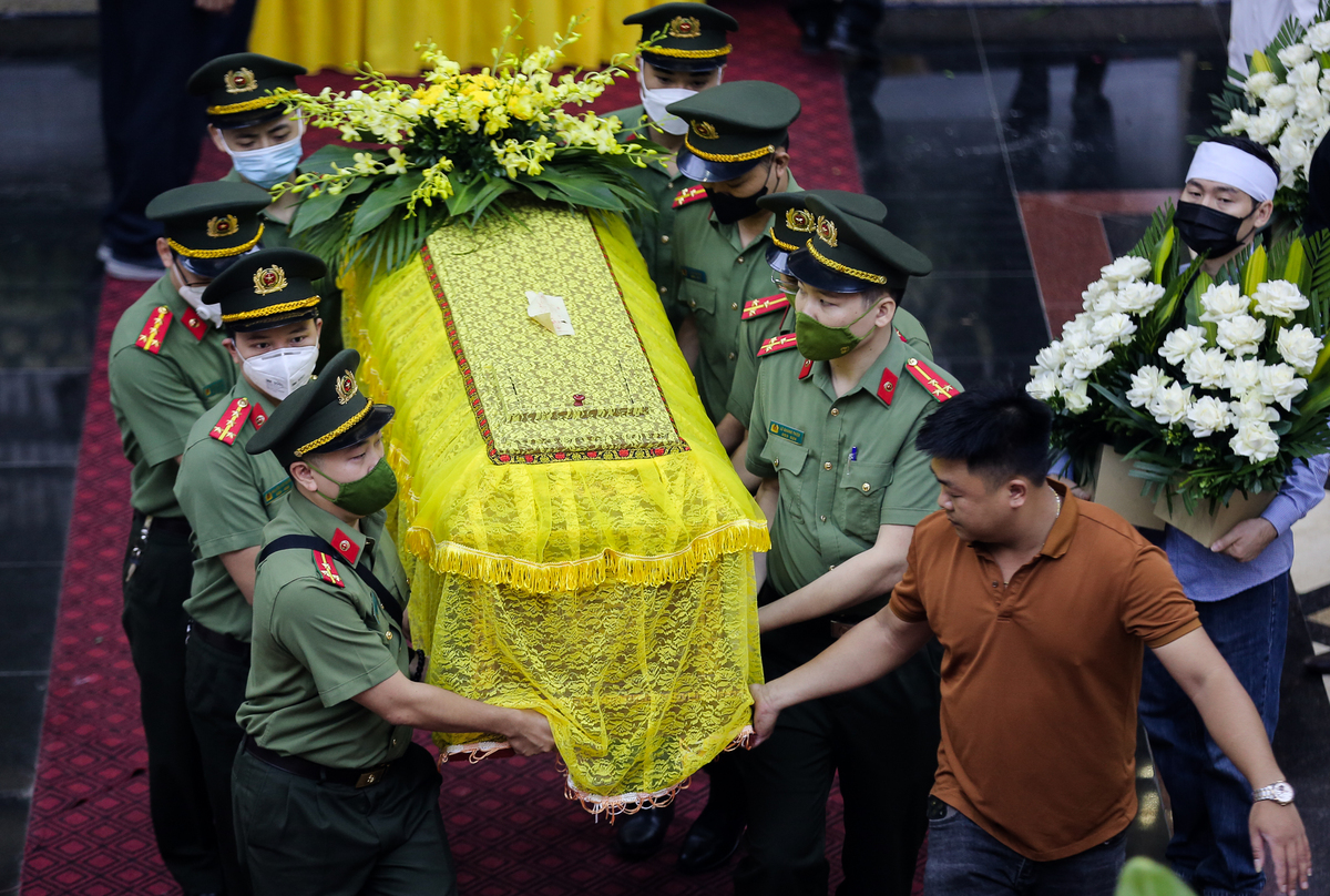 Linh cữu 4 nạn nhân lần lượt được đưa ra 4 chiếc xe tang chờ sẵn ngoài nhà tang lễ.