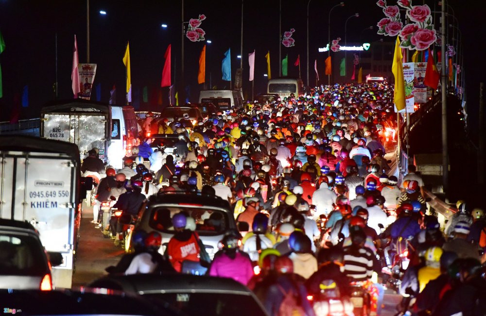 Cách cây cầu này khoảng 4 km hướng đi TP.HCM, hàng chục nghìn phương tiện chen chúc nhau di chuyển rất khó khăn. Từ vỉa hè, đường nhiều người di chuyển giữa mặt đường đầy ổ gà, bụi đất.