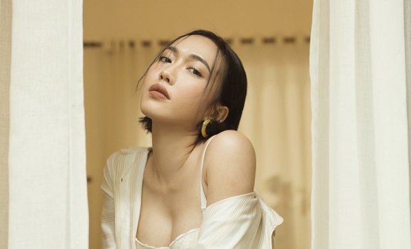 Diệu Nhi hờ hững khoe khéo vòng một gợi cảm và bờ vai trần.