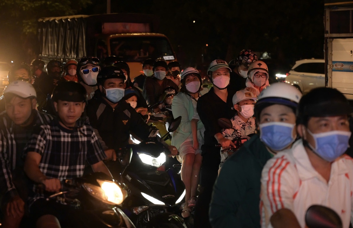 Đến 21h ngày 22/2 (mùng 6 Tết), khu vực cửa ngõ phía Tây TP.HCM vẫn đông phương tiện. Trên Quốc lộ 1 (đường Lê Khả Phiêu), dòng xe máy từ các tỉnh miền Tây đổ về nối dài nhiều đoạn, di chuyển chậm khi qua các giao lộ lớn và khu vực đèn tín hiệu.