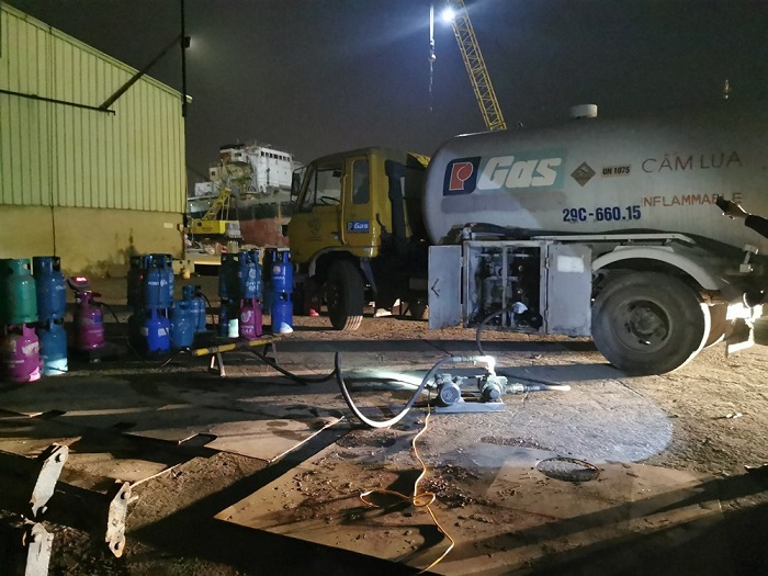 Cụ thể, lúc 20h45 ngày 17/1, nhận được tin báo tại khu vực bãi trống trong cảng Lê Quốc (quận Hồng Bàng, TP Hải Phòng) xảy ra hoạt động sang chiết khí hóa lỏng LGP, Đội Cảnh sát Phòng cháy chữa cháy trên sông (thuộc Phòng Cảnh sát Phòng cháy chữa cháy và Cứu nạn cứu hộ - Công an TP Hải Phòng) nhanh chóng xuống kiểm tra.
