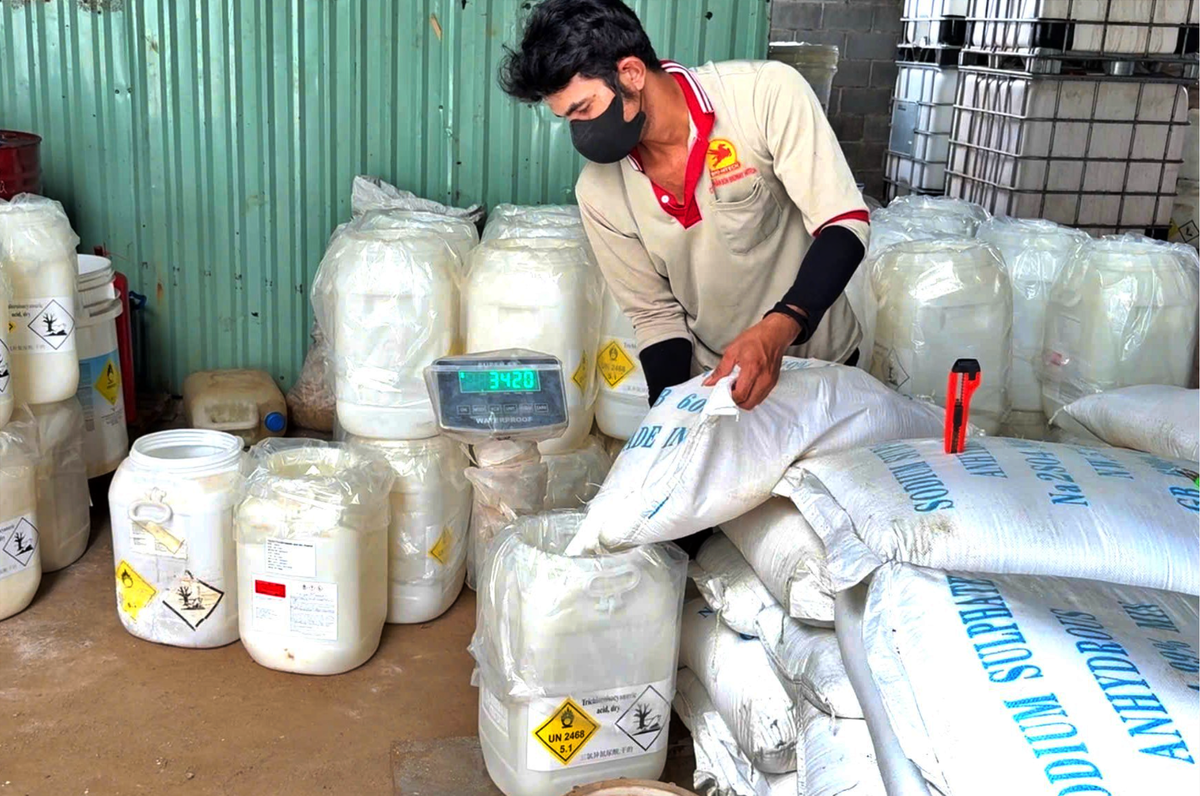 Tại thời điểm kiểm tra, bên trong khu vực nhà xưởng rộng khoảng 1.000m2 có 4 công nhân làm việc. Khu vực kho rộng khoảng 150m2 chứa nhiều loại hóa chất dùng làm nguyên liệu, cùng với công cụ, phương tiện sản xuất và số lượng lớn hàng hóa thành phẩm.
