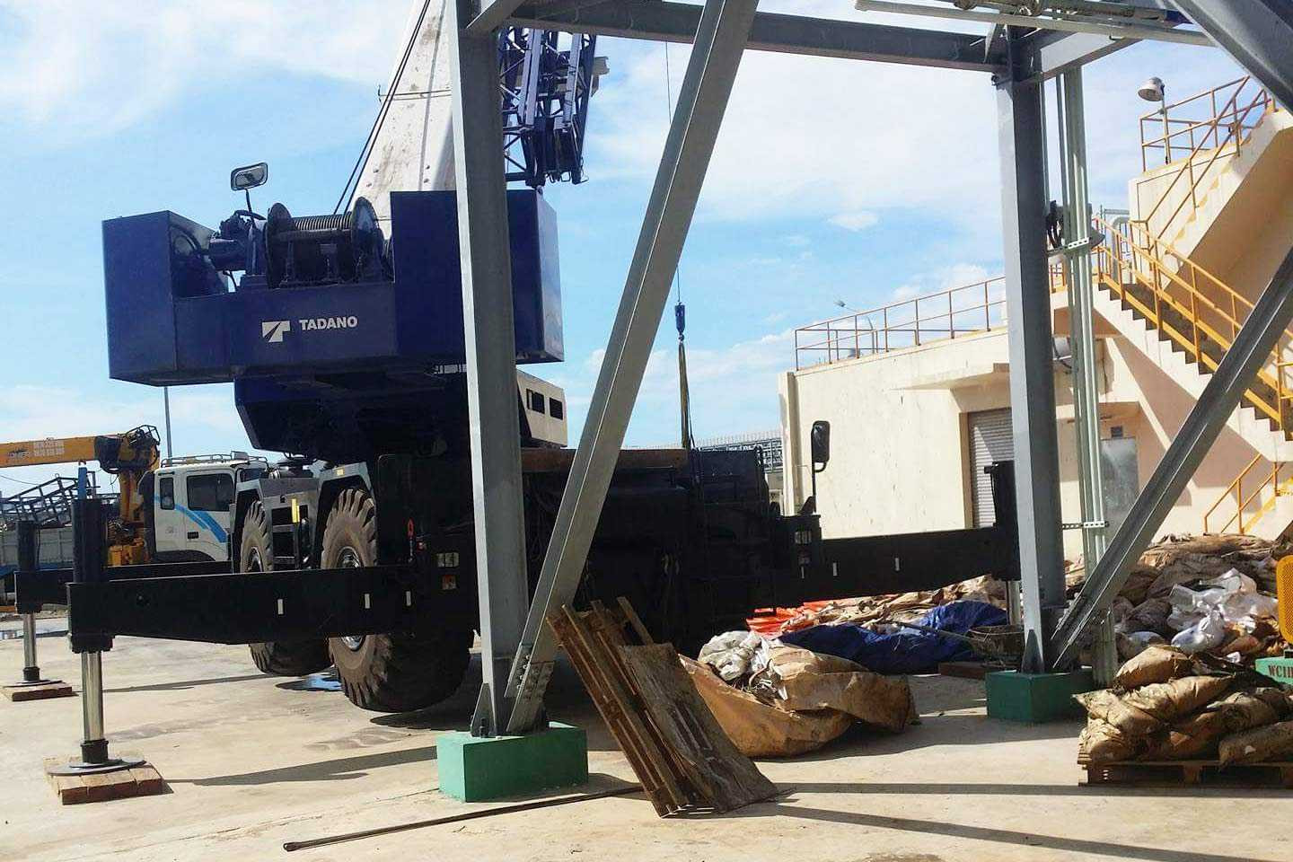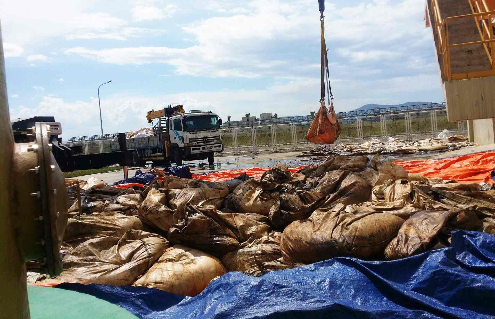 Những bao bì chất thải rất nặng, Formosa phải dùng cần cẩu để chuyển từng bao thải lên xe đợi sẵn. Chiếc xe này mang BKS 74C-04663.