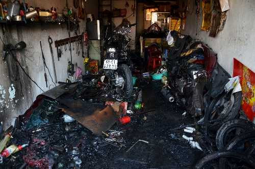 Tại hiện trường, vụ cháy làm thiêu rụi nhiều tài sản của các nhà dân, quán nhậu, cửa hàng sửa xe, phụ tùng xe, vật liệu xây dựng...