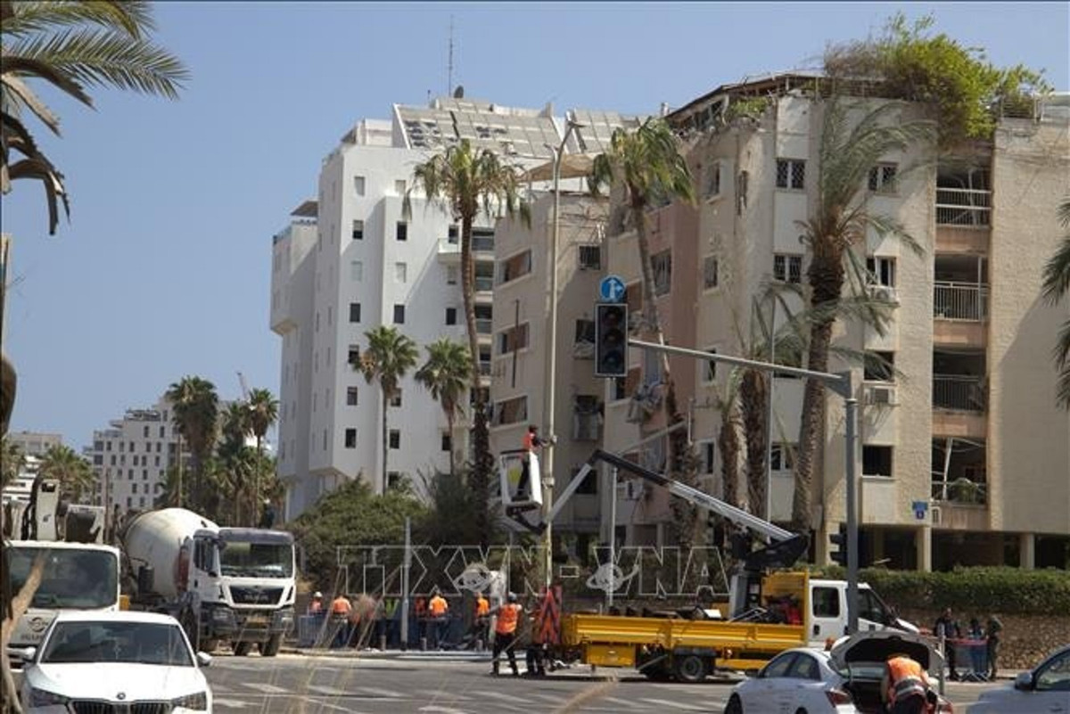 Một tòa nhà chung cư ở đường Levy Eshkol ( Tel Aviv) bị phá hủy do trúng tên lửa rạng sáng 16/6/2025.