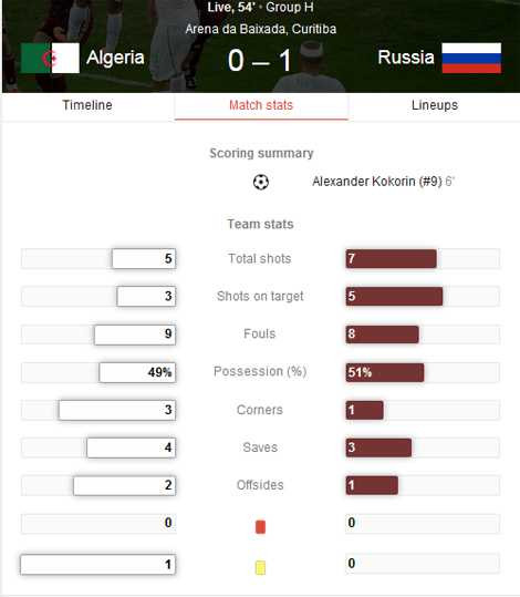 Nhưng rồi với quyết tâm không cao, thi đấu có phần hời hợt, Nga đã để cho Algeria có bàn thắng gỡ hòa ở phút 60. Bàn thắng đưa Bỉ vượt lên dẫn trước Hàn Quốc chỉ làm tăng thêm sự tiếc nuối cho đội bóng xứ Bạch Dương.